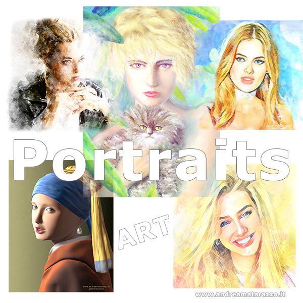 5 Portraits of women created with various techniques, always with an expressive, poetic soul, between the modern and the traditional. Oil on canvas, computer graphics 2d with paint effect, and 3d. Final image in computer graphics. jpg