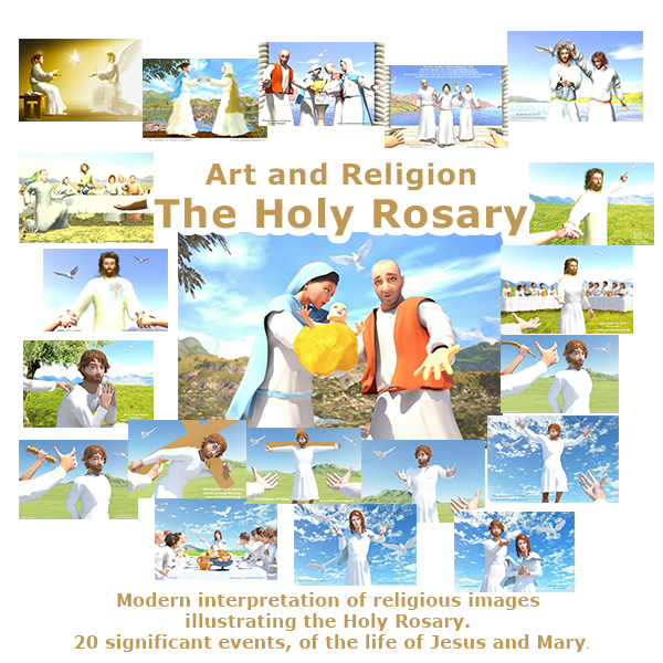 Modern interpretation of Religious Christian images illustrating the Holy Rosary. 20 significant events, of the life of Jesus and Mary. Renewal created with 3d and 2d computer graphics with an expressive soul . Inspiration from many famous artists such as Leonardo da Vinci, Piero della Francesca and others. Art aimed at engaging and excite the faithful and give hope, as was the case in some paintings of ancient art, combined with modern virtual reality techniques in computer graphics. The word Rosary means "Crown of Roses" we give to Our Lady. The Holy Rosary is considered a complete prayer, because it summarizes the entire history of our salvation. Indeed, with the Rosary we meditate on the "mysteries" of joy, light, pain and glory.